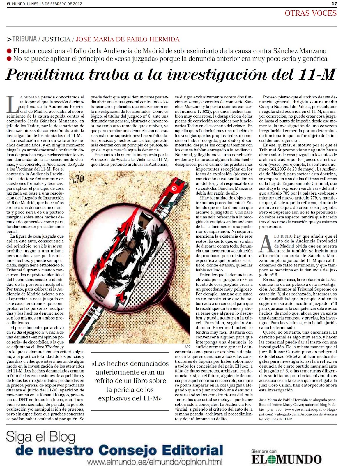 Admitida a trámite una querella contra Sánchez Manzano y la perito - larean - 12-02-2012 Rujpi, de Abascal lo espero todo. ¿No fue acaso el que, en su escrito de conclusiones previas, incluyó un supuesto temporizador de ETA (en realidad de lavadora), que estaría en posesión DE SU DEFENDIDO, o cuando menos en su domicilio? ¿Qué pretendía, demostrar que el defendido colaboraba con terroristas? ¿A quién se le ocurre? Para mí, sólo al que pone por encima de la defensa de su cliente una versión interesada de los hechos. Podríamos incluso ir más allá y comentar que los abogados defensores conspiracionistas actuaron varias veces en perjuicio de sus representados, al concentrar la defensa en una locura conspiranoica y no en una sólida y profesional impugnación de las pruebas, como sí hizo por ejemplo Gerardo Turiel, abogado de Trashorrras. A gente como Abascal, a mi juicio, habría que echarlos a patadas del Colegio. Admitida a trámite una querella contra Sánchez Manzano y la perito - morenohijazo - 12-02-2012 Totalmente de acuerdo, Larean. Bueno, en general con todos vosotros, siempre tan sensatos. Y, Pablo (hijo de SM): aparte de lo ya señalado por Hermanita sobre el "periodismo de investigación" de "El Mundo" (periodismo de acoso, de abuso de poder, canallesco y que hace hervir la sangre) leía también lo de la enfermedad de tu madre... ¡animo, que la medicina ha progresado mucho! Y es muy importante, conservar el buen ánimo y esperanza para luchar contra las enfermedades crónicas. La mongolada ésa de Montes, ni la comento. Si me acuerdo (y lo encuentro) subiré el Auto de libre sobreseimiento de Montes, para que se vea el caso de gravísima indefensión del equipo de Urgencias de Leganés, las grotescas equivocaciones (algunas son incluso, hilarantes) de la Comisiones creadas por la Comunidad y el Colegio de Médicos de Madrid... Es otro ejemplo de cómo, cuando las sentencias judiciales no nos gustan, no es que las critiquemos (lo cual es lícito) sino que, directamente, las ignoramos y seguimos diciendo que tal o cual es un asesino... Admitida a trámite una querella contra Sánchez Manzano y la perito - larean - 12-02-2012 Es verdad, Pablo. Ya me imagino lo que habrá sufrido tu madre. Dale nuestros más cariñosos recuerdos y nuestros votos de que, superada esta prueba, ella podrá superar la suya con mucho mejor ánimo. Admitida a trámite una querella contra Sánchez Manzano y la perito - Hermanita - 12-02-2012 Siguen los peones respìrando por la herida: belga197, el día 12 de Febrero de 2012 a las 17:32, en el blog de Luispi Wrote:A pesar de todo me gustaría plantear una cuestión para que los "expertos jurídicos" de toda condición y pelaje me den una respuesta. Belga197 era el peón estrellita del blog de Luis del Chino, y solía entender lo que leía. Pero se ve que con el paso de los años y las malas compañías también ha quedado contaminado por la característica incomprensión lectora de los peones. ¿Cómo, si no, puede decir que "[En la querella de AES] no se describen los hechos y ni siquiera lo llega a hacer el juez del juzgado nº 6 en su auto de sobreseimiento"? ¡Caramba! Una denuncia (que no querella, como Rasmo puntualiza en balde una y otra vez) a la que se acompaña un libro entero de 438 páginas para que se investigue si los hechos que éste contiene son constitutivos de delito, ¿cómo no va a contener una descripción de los hechos? ¡Es una denuncia con 438 páginas, nada menos, de descripción de hechos! ¿Y cómo puede Belga decir que "Resumiendo, tampoco en el auto de la Sala 17 se establece cuáles son los hechos comunes a las dos querellas"? ¿A qué, entonces, según Belga, se dedican las páginas 9, 10, 11 y 12 del Auto en cuestión? ¿Acaso no dice la Sala en esas páginas "Dicha denuncia basaba los hechos en", "Como se puede apreciar la narración de hechos contenida en la denuncia", "Hasta aquí hemos expuesto los hechos que se denunciaban", "Pasemos a analizar los hechos que se denuncian en la querella presentada por la Asociación de Ayuda a las Víctimas del 11M"...? Una y otra vez el auto dice que está hablando de hechos, describe hechos, compara hechos, señala hechos... No es que haya que ser un fino exégeta para darse cuenta de que en esas páginas el auto está "estableciendo cuáles son los hechos comunes a las dos querellas", eso que Belga dice que no hace. No solamente lo hace, sino que va avisando: "¡Eh, que voy a señalar cuáles son los hechos comunes!" "¡"Eh, fíjense, la primera denuncia contiene estos hechos, y la querella actual estos otros!". En fin, amigos: nos hacemos mayores. La decadencia es imparable. Ni los peones son ya lo que eran. Véase este pobre muchacho, Belga. Qué pena, Señor, qué pena. Sic transit y todas esas cosas. Admitida a trámite una querella contra Sánchez Manzano y la perito - Quetza - 12-02-2012 En este enlace se puede leer la denuncia de AES (al final) y el auto del JI nº 6. belga sic transi Wrote:La querella de AES sólo se refiere a los resultados contradictorios de la pericial de 2007 respecto de los hechos probados de la sentencia del 11-M.Si es que son unos mentirosillos redomados. denuncia Aes Wrote:Es de dominio público que en la investigación y periciales practicadas intervinieron de forma decisiva: Y citan, además de a SM, a la perito y a otros mandos, al alférez UCO Jaime Trigo y al General Félix Hernando que para nada intervinieron en la pericial o en la recogida de muestras. Es una denuncia que abarca hechos presuntamente delictivos mucho más amplios que los supuestamente revelados por la pericial. Admitida a trámite una querella contra Sánchez Manzano y la perito - axl - 12-02-2012 Ojito a lo que vomita La Gaceta en defensa de Cillán. Alcanzan tal nivel de cinismo que no he sido capaz de terminar el artículo: Quote:Corifeo contra la juez Coro La gaceta Admitida a trámite una querella contra Sánchez Manzano y la perito - dosporcuatro - 12-02